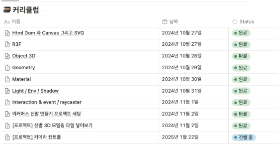 three.js를 공부해야겠다 생각한지 꽤 된거 같은데, 결국 퇴사하고 나서야 공부할 결심히 섰다. 어떤 것부터 공부해야할까 고민하던 차에, React 환경에서 Three.js를 구현해볼 수 있는 강의가 있다는 소문을 듣고 인프런에서 찾아낸 [React Three fiber로 배우는 인터렉티브 3D 웹개발] 강의를 듣기 시작했다. 처음엔 Three.js로 3D 입체를 구현해낸다는 것에 감격해서 매일 강의를 세네개씩 몰아들었다. 팀플이 바빠지기 시작하면서부터 중간에 세달 정도 쉬었고 여유가 생긴 최근에서야 다시 듣고 있는데 이럴수가 여전히 재밌다. 4-5년전 (프론트엔드 개발자라면 누구나 알고 있는) 구글 인터렉티브 개발자 종민님을 보면서 개발자의 꿈을 키웠었는데, 요 몇달 Three.js를 구현해보면서 그때 그 초심으로 돌아가게 된 것만 같았다.